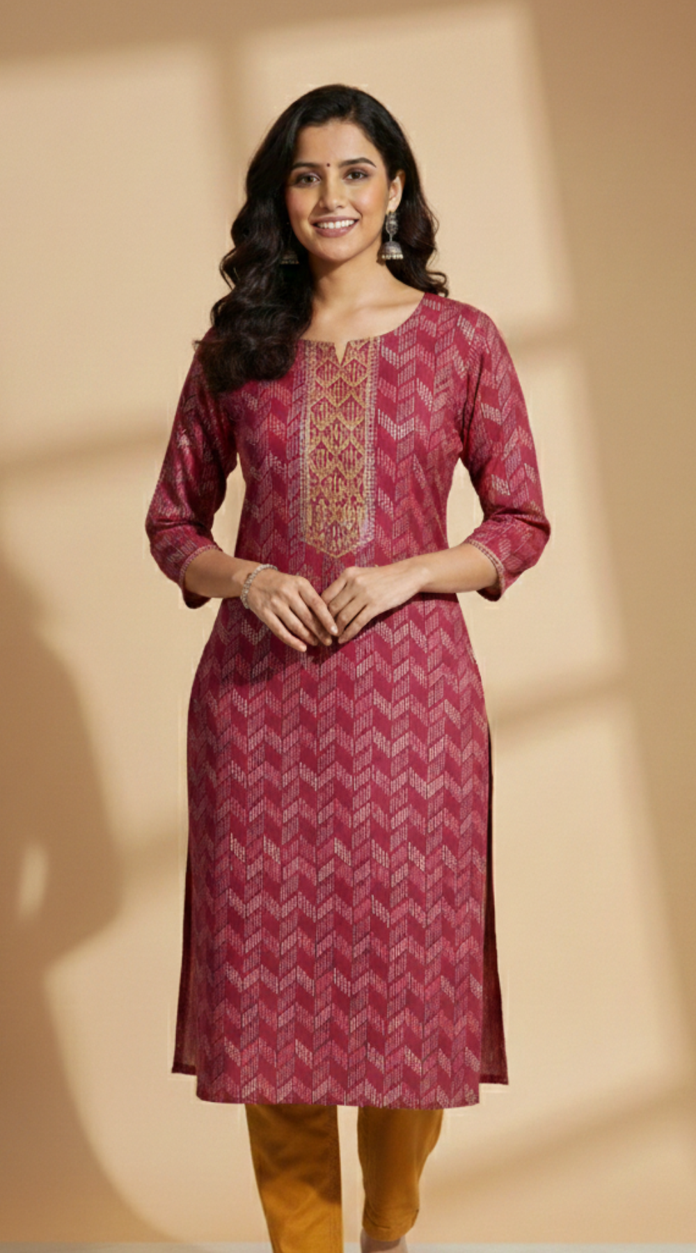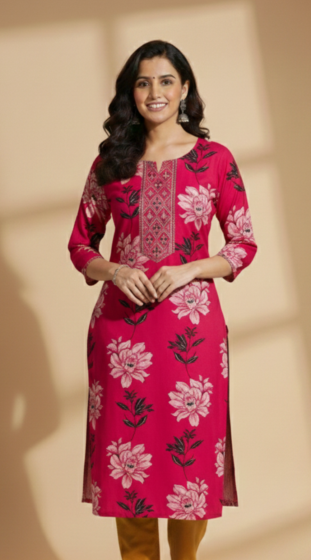 Hot Pink Rayon Office Wear Kurti with Embroidered Front Panel