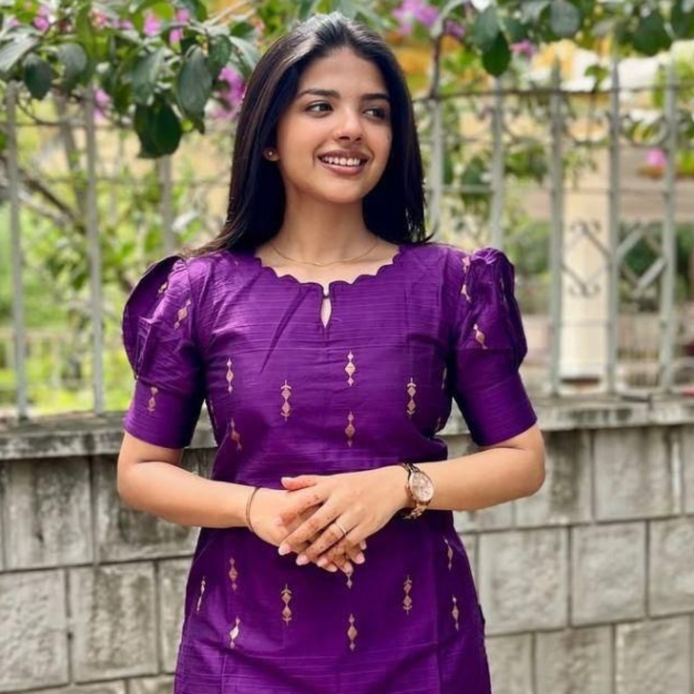 Purple Roman Silk Puff Sleeve Trendy Neck Lining Kurti – Elegant & Modern Charm