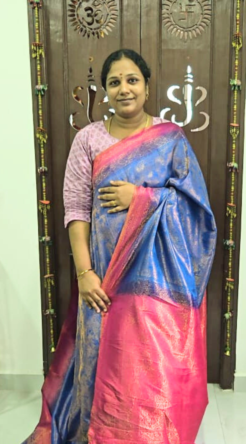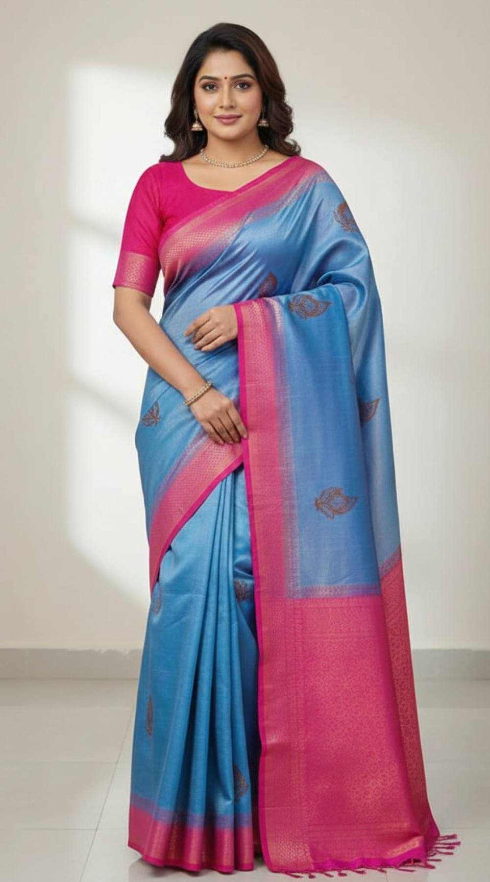 Color: Elegant royal blue body with contrasting pink pallu and border
