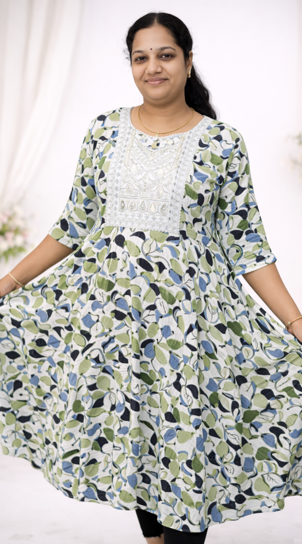 Green Shade Popcorn Printed Umbrella Kurti with Embroidered Yoke