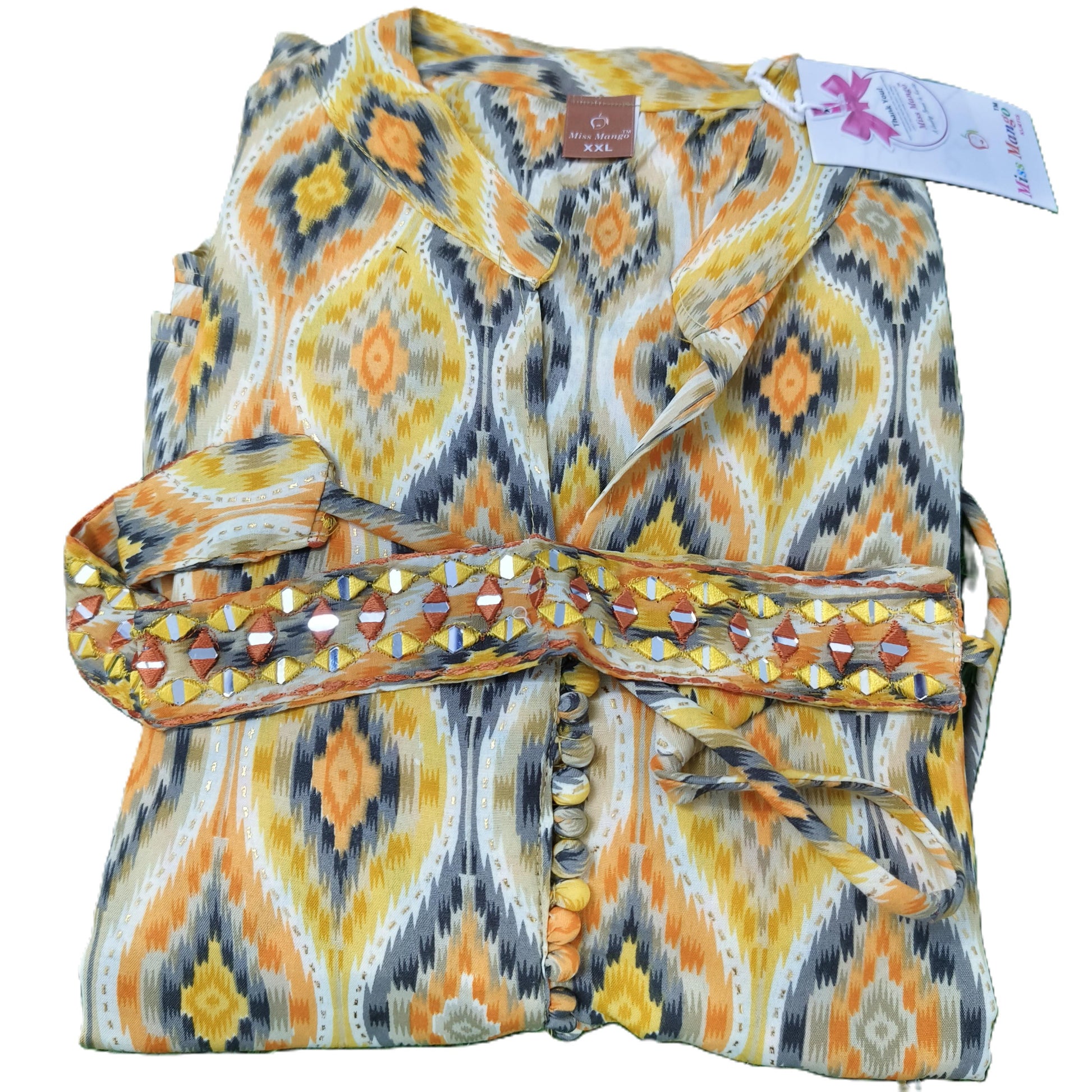 Make a stylish statement with our Umbrella Collar Neck Kurti, crafted in vibrant Ikat-inspired prints that blend tradition with modern elegance. This kurti comes with a detachable mirror-work belt, adding a festive and trendy touch to your overall look. Designed for comfort and style, it features front fabric buttons, a charming collar neckline, and a flowy silhouette perfect for both everyday wear and special occasions.