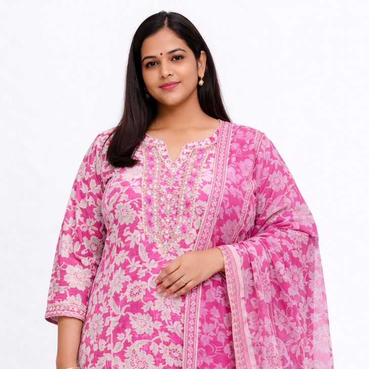 Pink Cotton 3 Piece Kurti Set with Dupatta - Office wear